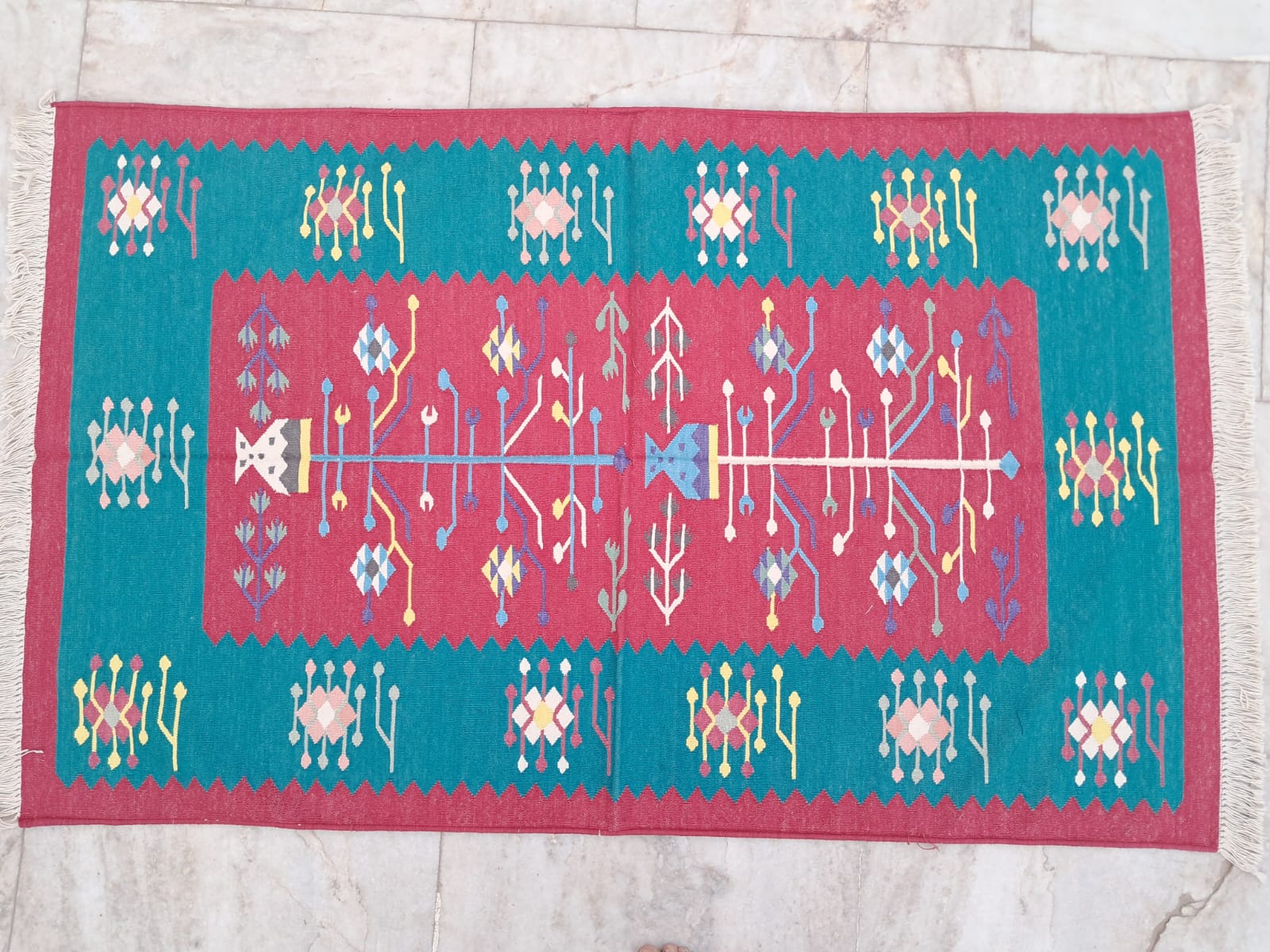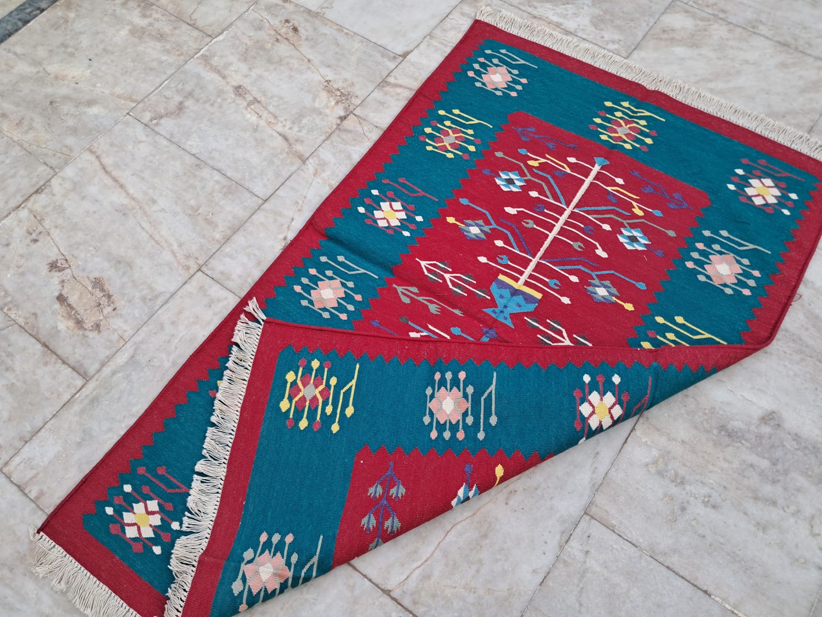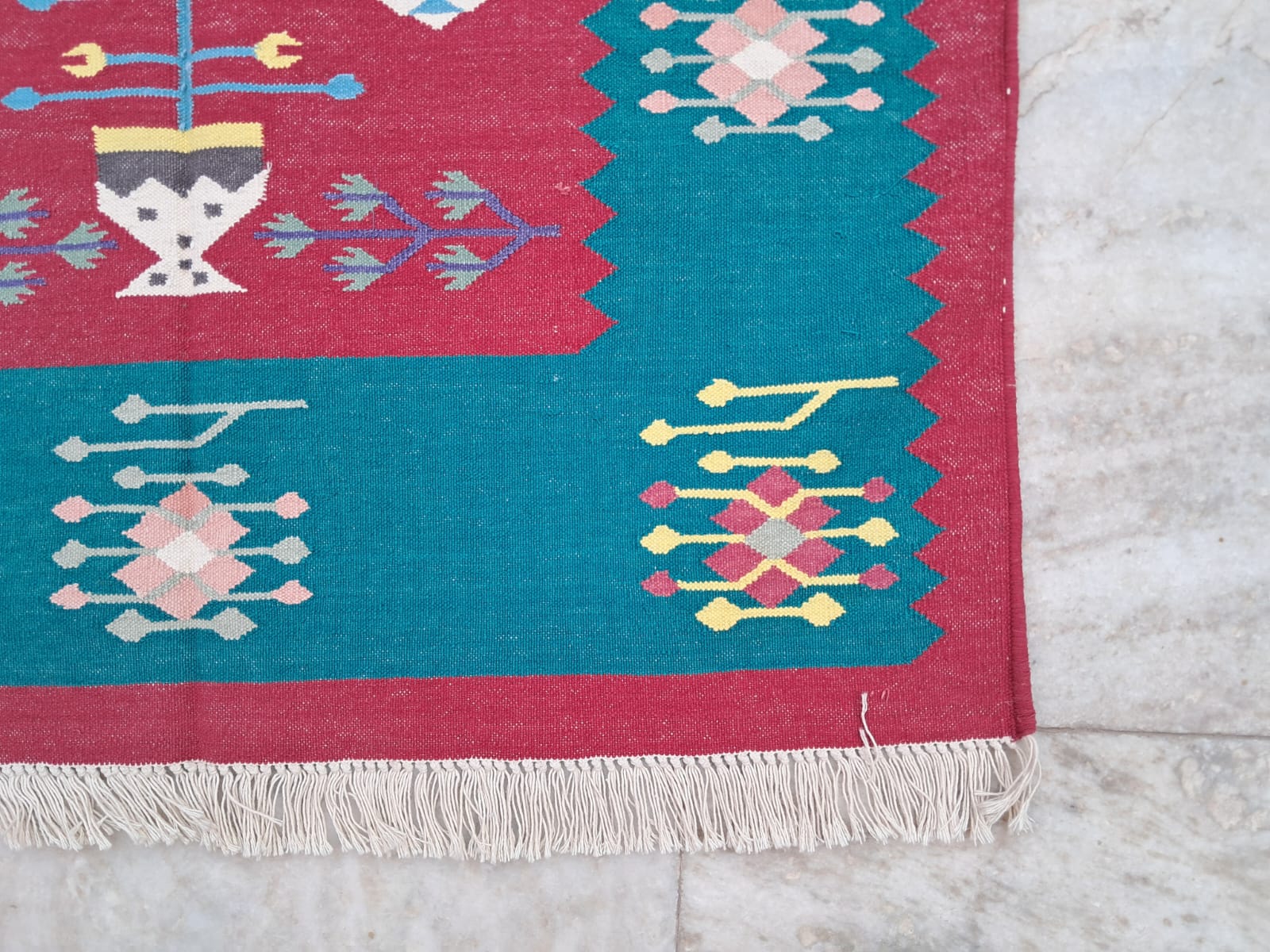 Bring a touch of artisanal warmth to your home with our premium 3x5 ft handwoven cotton rug. Crafted by skilled artisans, this flatweave carpet is designed to be as durable as it is beautiful. Because it is made from 100% natural cotton fibers, it is lightweight, highly breathable, and remarkably soft underfoot—making it the perfect foundation for any room. Read less